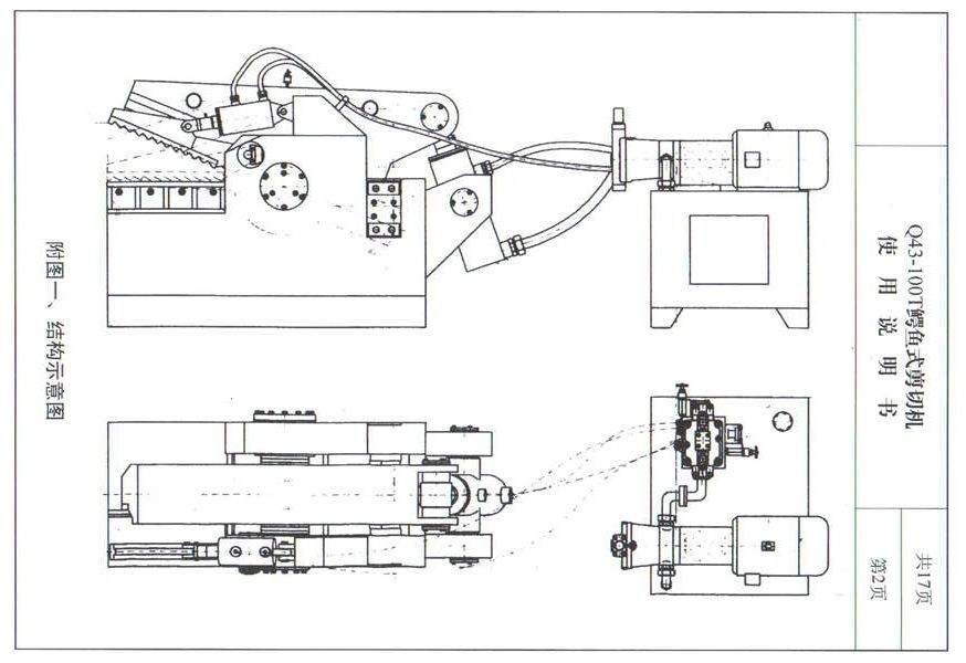 金屬剪切機(jī)由液壓裝置提供動(dòng)力,驅(qū)動(dòng)液壓缸推動(dòng)拉力桿,通過主動(dòng)刀與定刀的上下咬合剪斷力,實(shí)現(xiàn)對金屬材料的剪切工作。結(jié)構(gòu)如下圖: