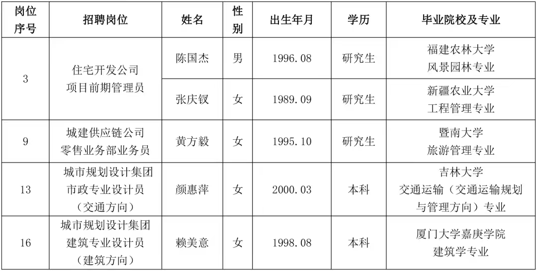 根據(jù)《泉州城建集團(tuán)校園招聘簡章》,現(xiàn)將泉州城建集團(tuán)校園招聘擬聘人選名單(第二批次)進(jìn)行公示。公示期間,如對公示對象有異議,請及時(shí)向我司反映。擬聘人選名單如下: