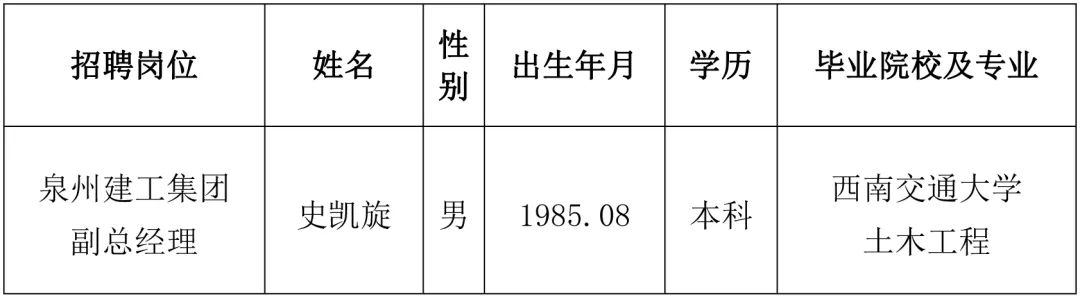 根據(jù)《泉州建工集團(tuán)有限公司副總經(jīng)理公開(kāi)招聘簡(jiǎn)章》,現(xiàn)將泉州建工集團(tuán)副總經(jīng)理擬聘人選進(jìn)行公示。公示期間,如對(duì)公示對(duì)象有異議,請(qǐng)及時(shí)向我司反映。擬聘人選如下: